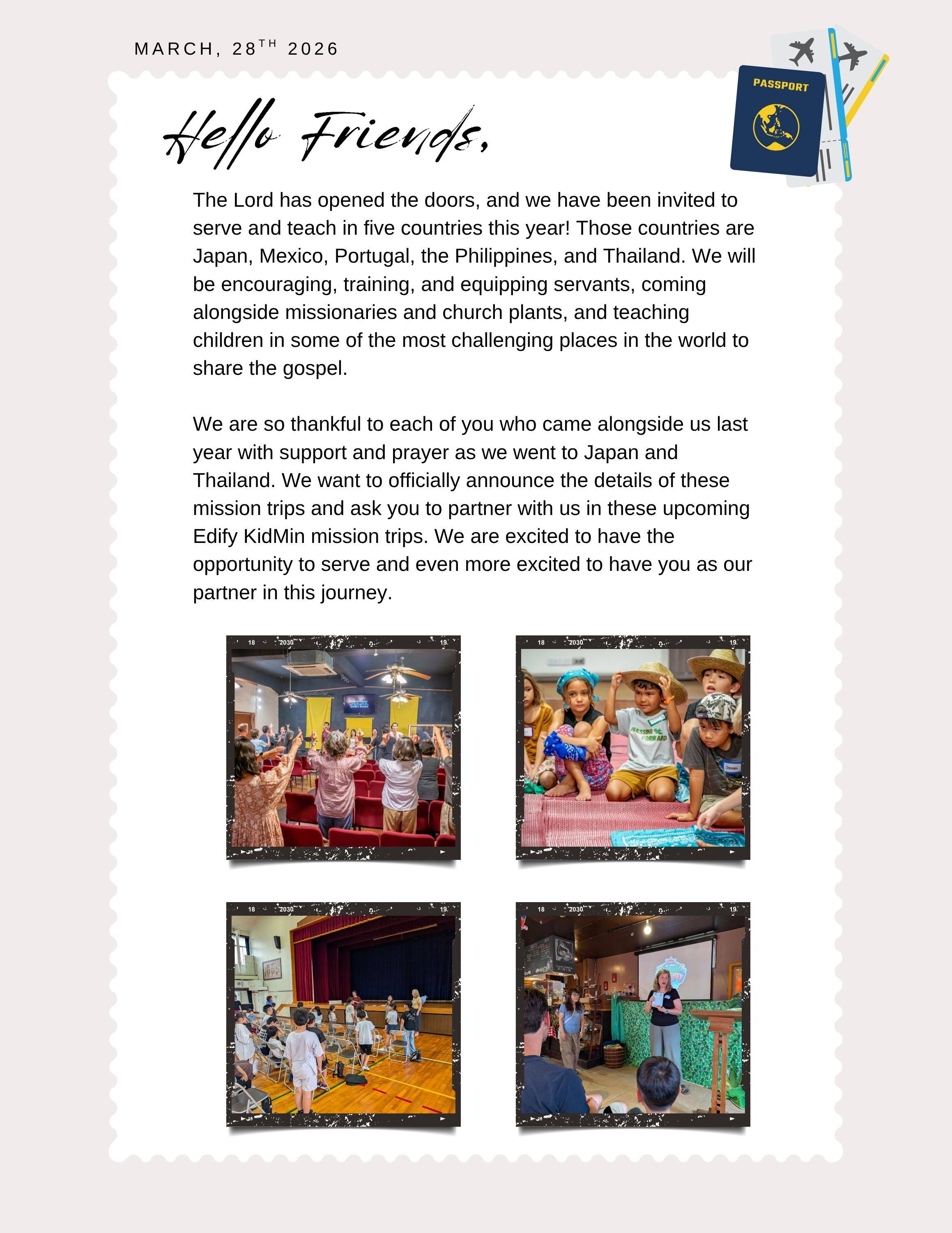 Welcome to Edify KidMin. Our monthly email enables you to follow our ministry journey as we train, travel, and equip the church to teach and reach children with the gospel. Subscribe to our newsletter.