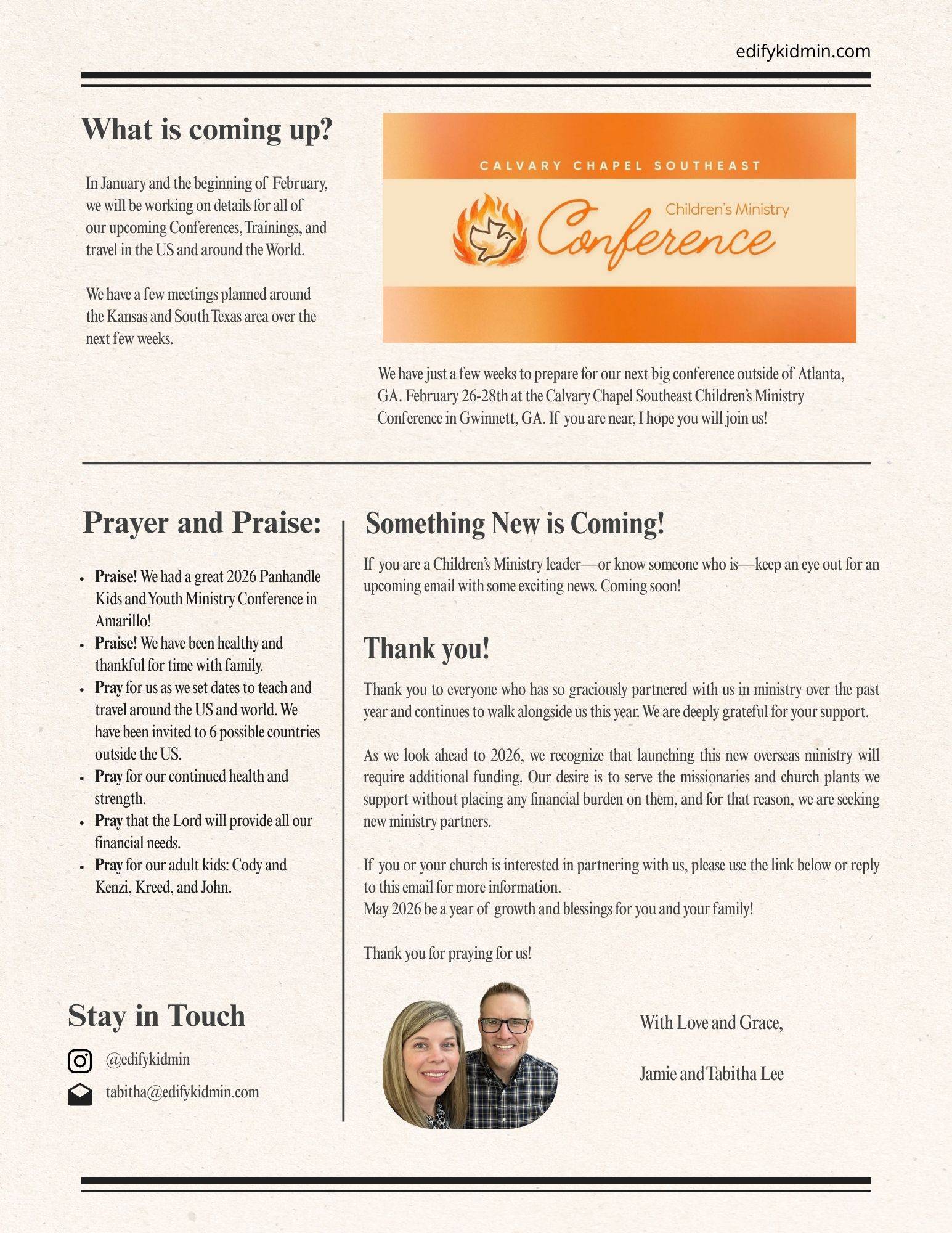 Welcome to Edify KidMin. Our monthly email enables you to follow our ministry journey as we train, travel, and equip the church to teach and reach children with the gospel. Subscribe to our newsletter.